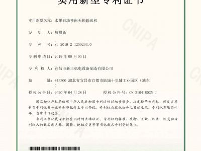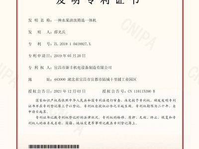 實用新型專利證書《一種環形加工的水果分選機》