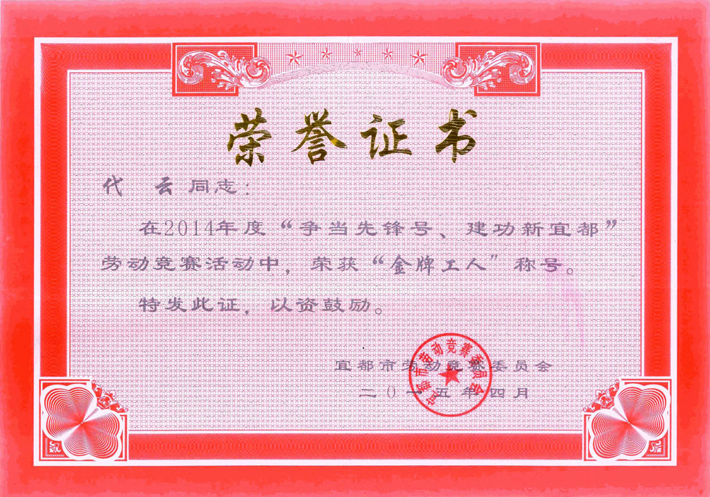 宜昌市新豐機電公司技術部長代云同志,在2014年度“爭當先鋒號、建功新宜都”勞動競賽活動中,經宜都市勞動競賽委員會評選為“金牌工人”榮譽稱號。